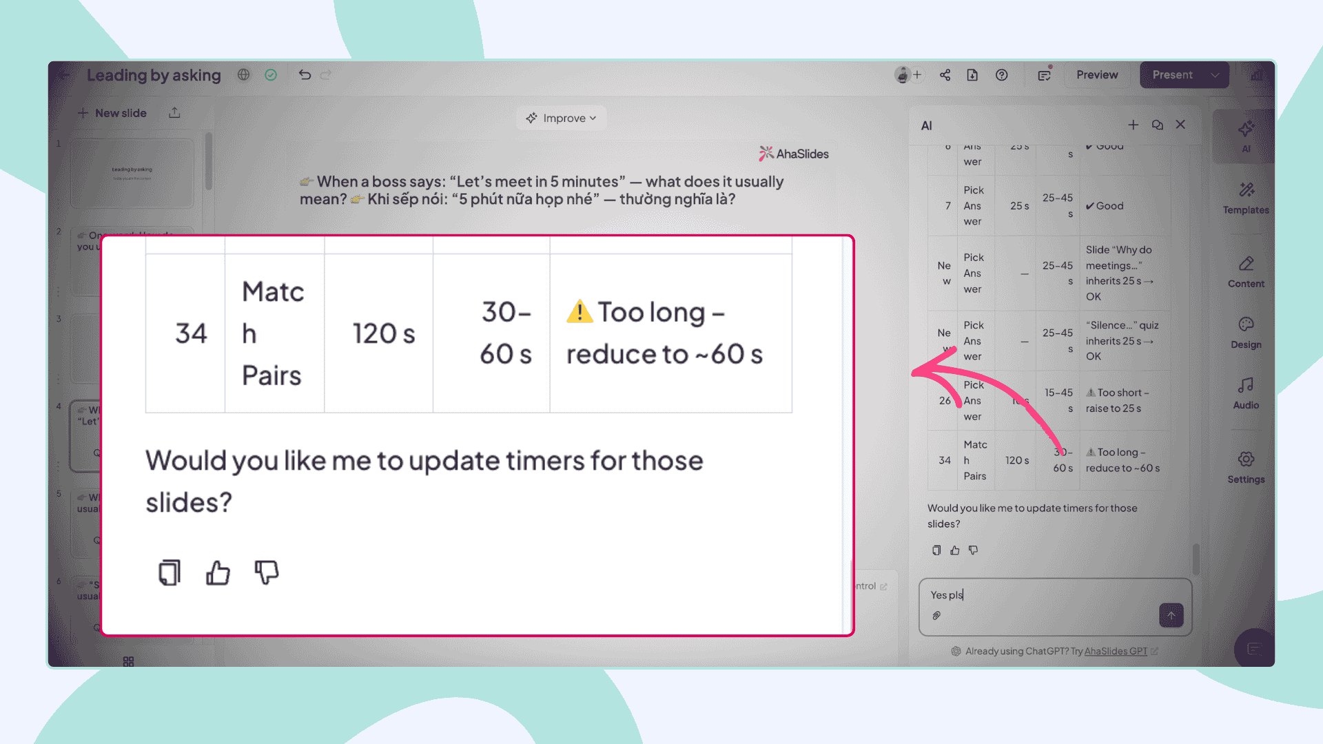 It can also now update settings for Spinner Wheel, Open Ended, Word Cloud, and Brainstorm slides directly through conversation. Configure multiple slides at once, without navigating menus. One less reason to click around before a session.
