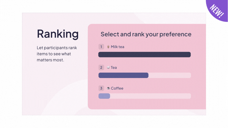 Ranking slide — ask your audience to put things in order. Perfect for prioritisation exercises, preference polls, and any time "which matters most?" is the question on the table.