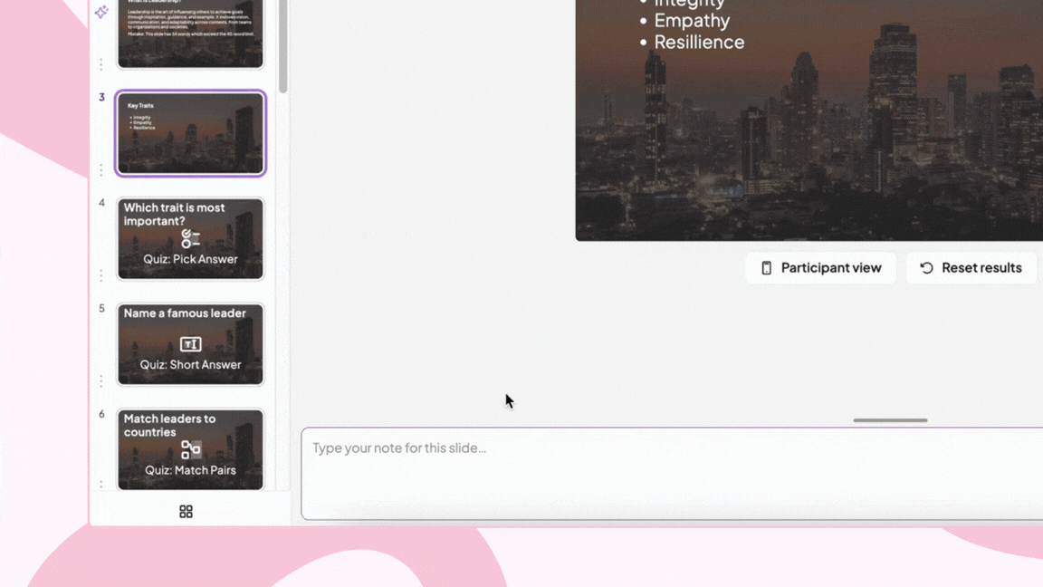 Think of it as your personal assistant for every session. Before you go live, ask Slides Agent to review your entire presentation — it'll scan for grammar and spelling errors, quiz timing issues, and gaps in your interactive content, flag what needs attention, then ask if you'd like it fixed. One reply and it's done.