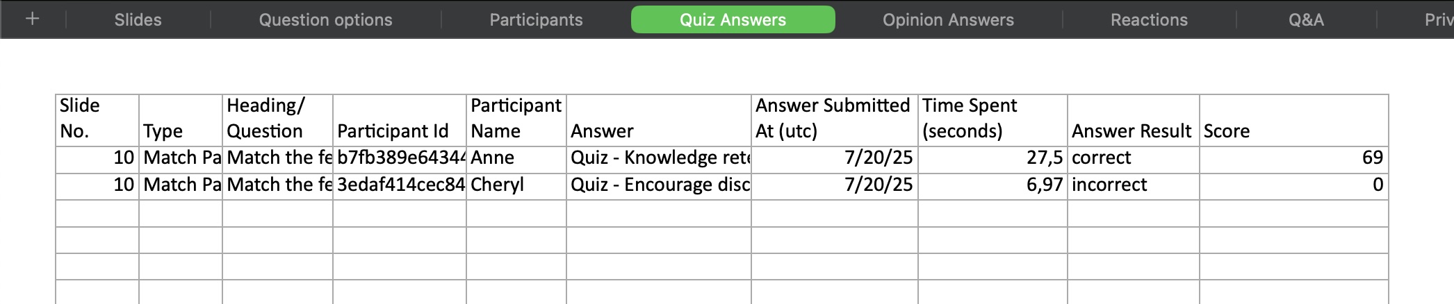 Complete activity breakdown — Every poll response, word cloud contribution, brainstorm idea, and Q&A interaction