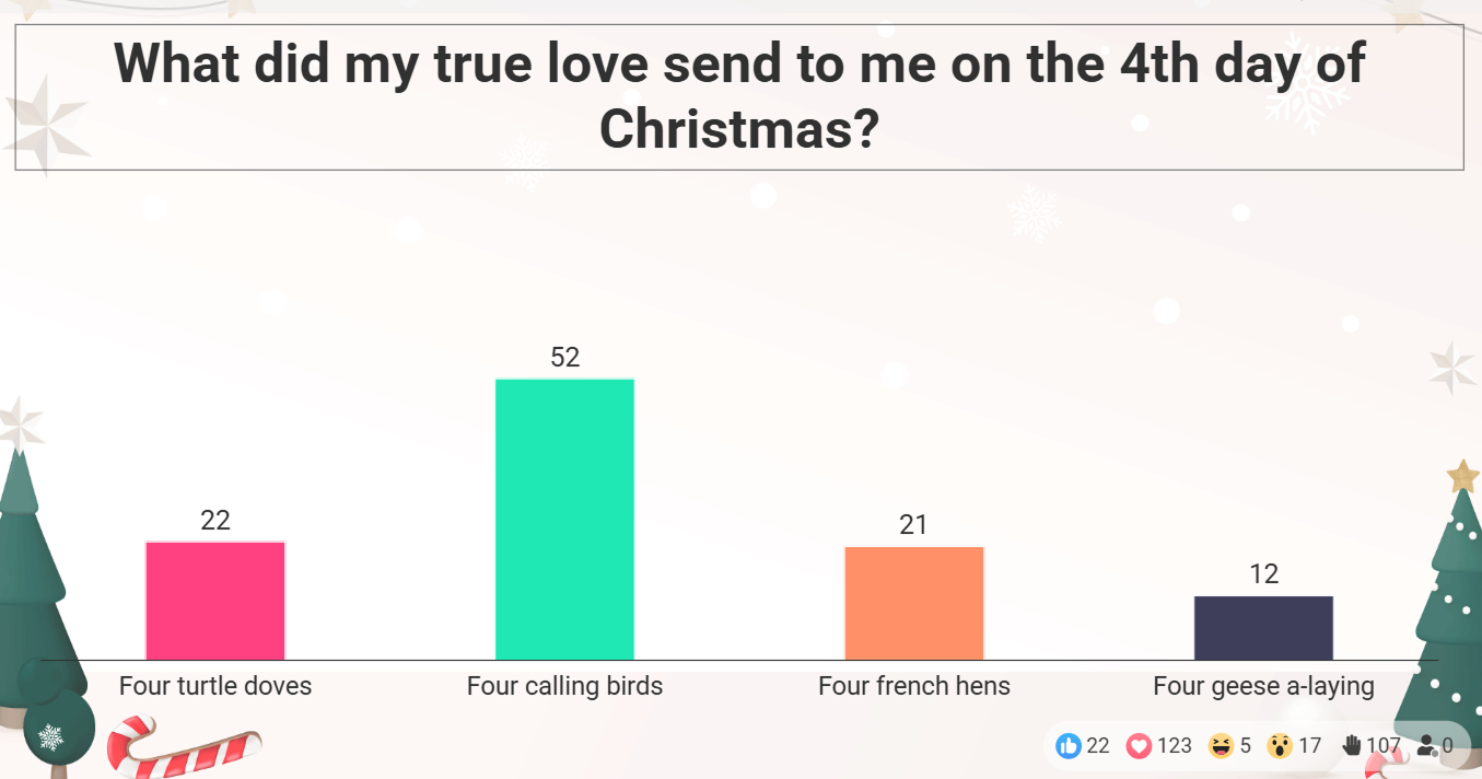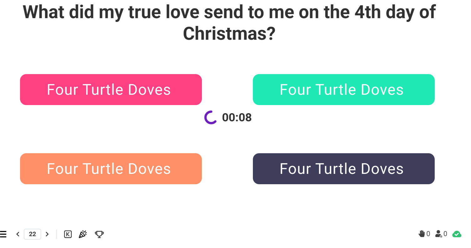 It would be nice to be able to show the answers during the time when a question is live in different views rather than just show them at the bottom of the screen. They are somewhat hard to read. This would be before the answers are revealed while the timer is live. The colors should match whatever the theme color is as well.