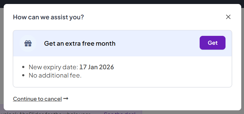 - Get extra free month: you can get 1 month for Monthly plans or 2 months for Yearly plans if you choose this option instead of cancelling your AhaSlides Subscription.