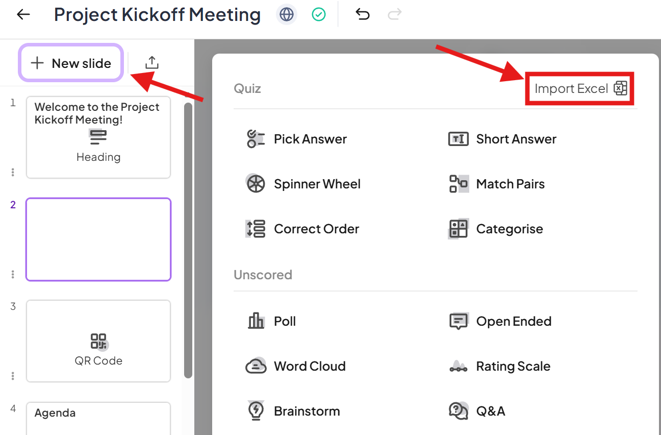 Click the '+ New slide' button and then 'Import Excel' in the top right corner of the pop-up.