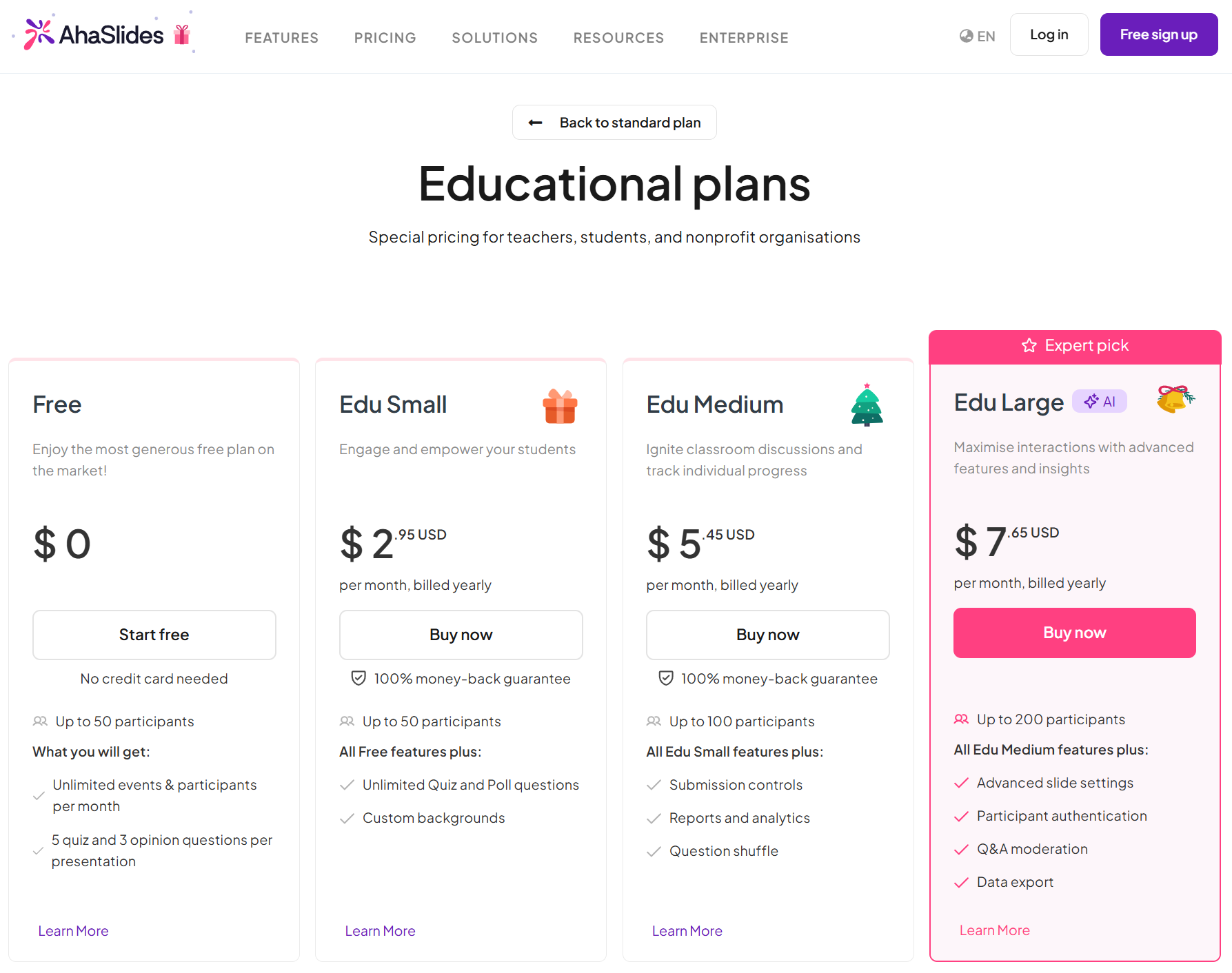 If you're a teacher, student, NGO or plan to use AhaSlides in some educational capacity, you can claim an Educational Plan at a discounted rate. These plans are all billed annually.