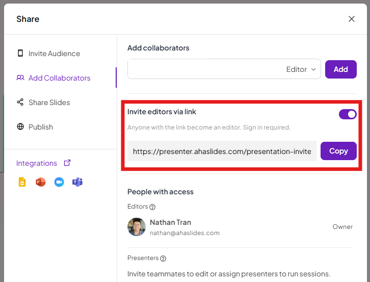 Clicking either of these will bring up the invitation menu. From here, you can enter your collaborators' email addresses and choose 'Editor' or 'Presenter' role for them