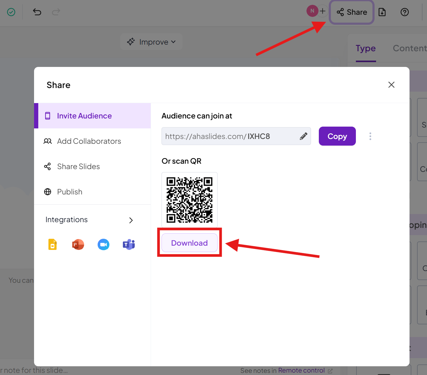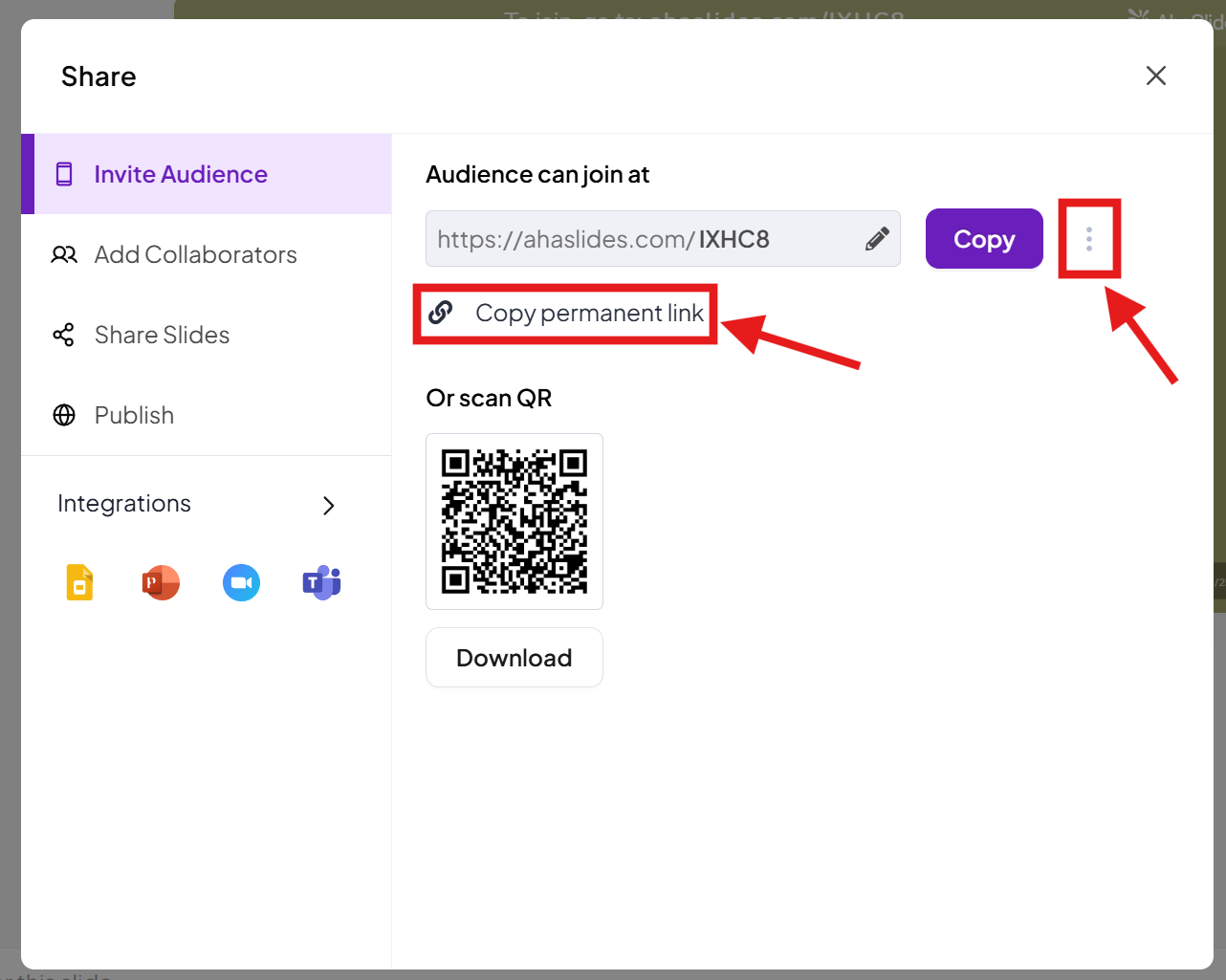In the 'Invite Audience' section of the 'Share' menu, you can see the option to download the QR code. Clicking this will download a PNG image file of your QR code, so that you can share it another way, such as printing it out or emailing it.