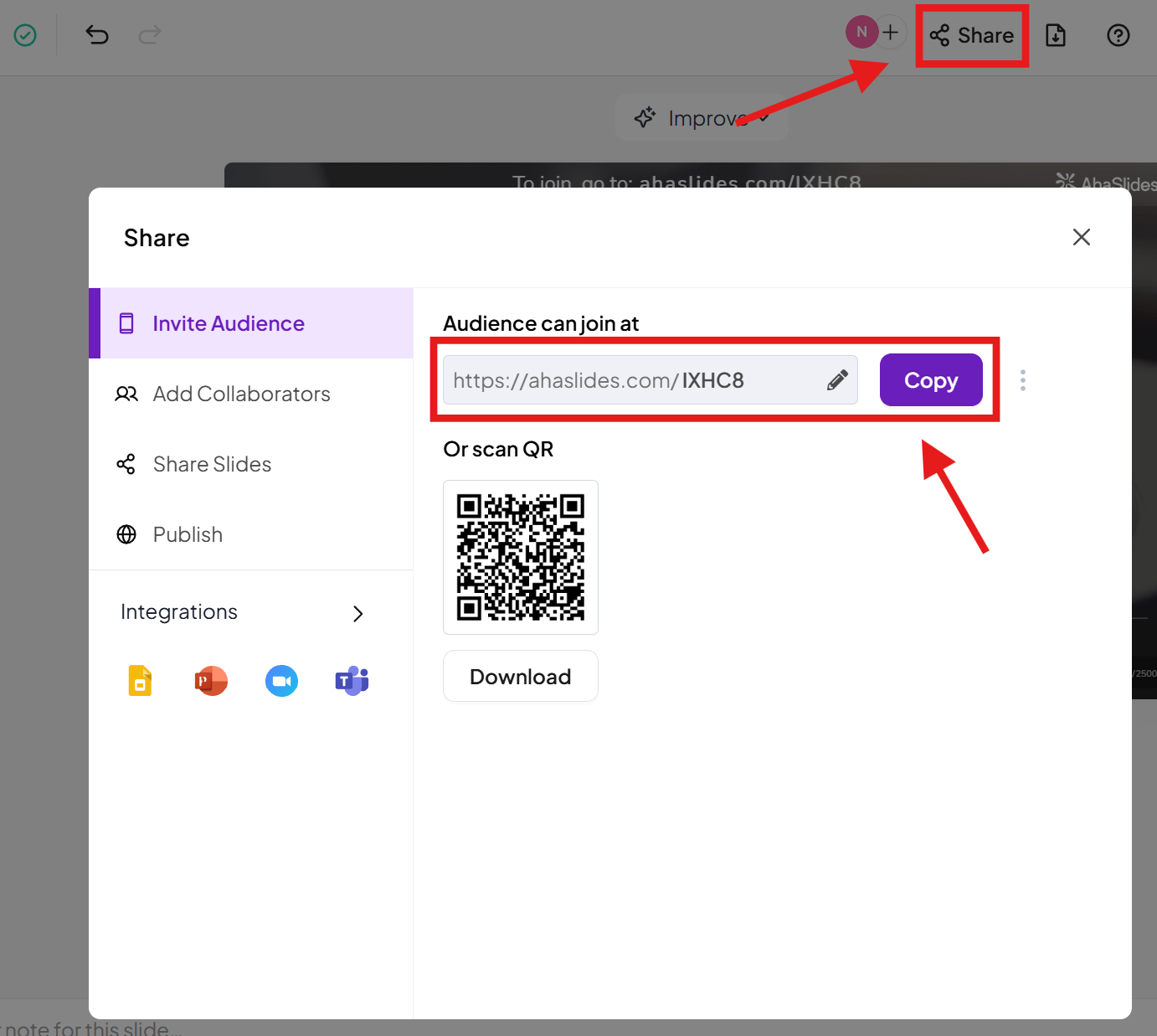 You can also find your URL access code by clicking on Share in the top-right of the editor. In Invite Audience tab, you will find a link under Audience can join at. You can click the Copy button here to copy the code to your clipboard...