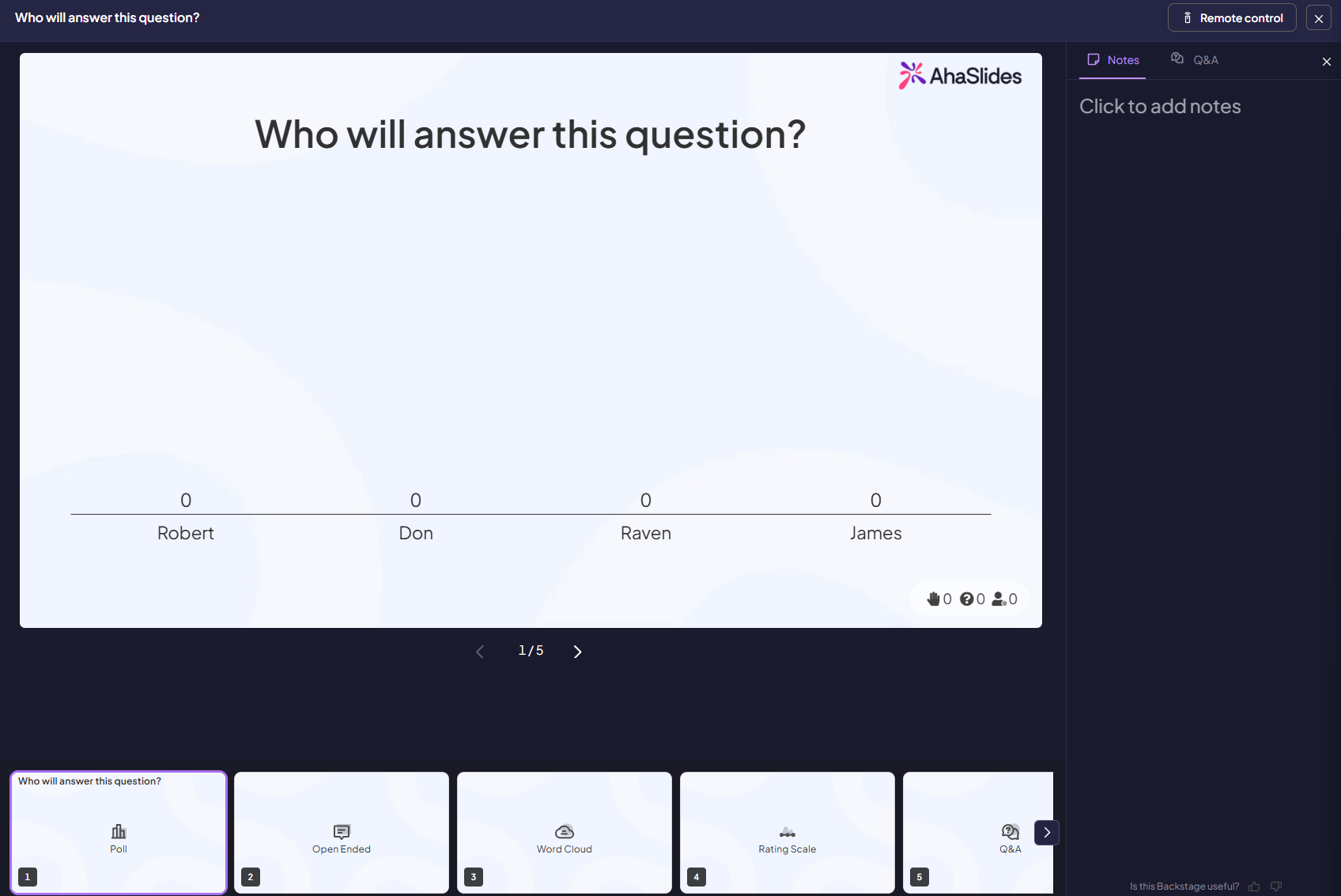 Backstage lets you control your presentation from a private window, enabling you to control the current slide, see upcoming slides, moderate Q&A, and view/edit speaker notes while presenting. Combined with the Remote Control, you can move freely ly while seamlessly advancing your slides, or even let a colleague take over slide control when needed, while you stay focused on presenting.