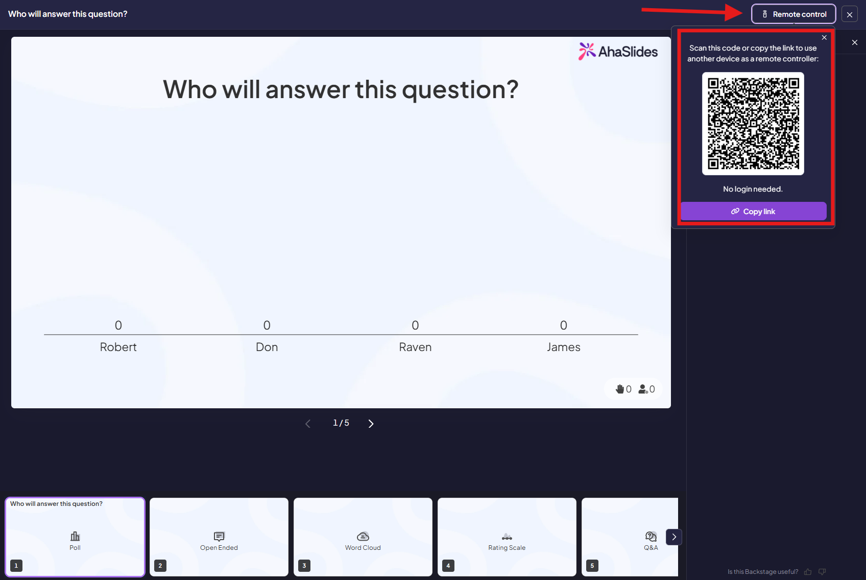 Scan the QR code or copy the link to use the Remote Control function on a separate device. This option is ideal for presenters who prefer to move around, as you won't need to be at the presenting computer. It also allows another person to easily take control of the slides, without requiring account access or direct use of the presenting device.
