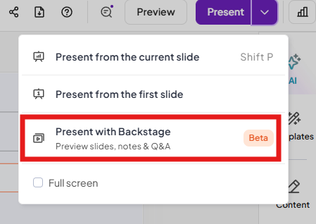 On the editor screen, navigate to the Present button in the top-right corner, press the down arrow, and choose Present with Backstage.