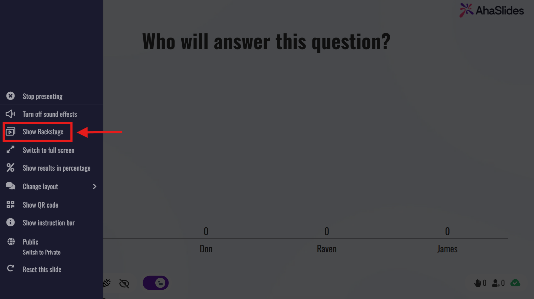 To start presenting with Backstage, select it as your presentation option. There are two methods: