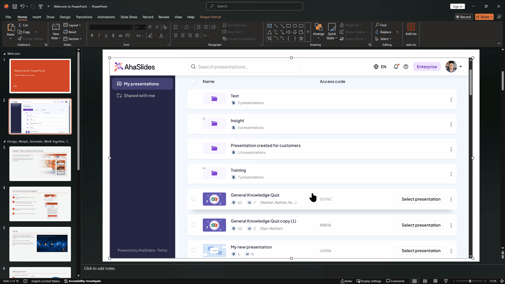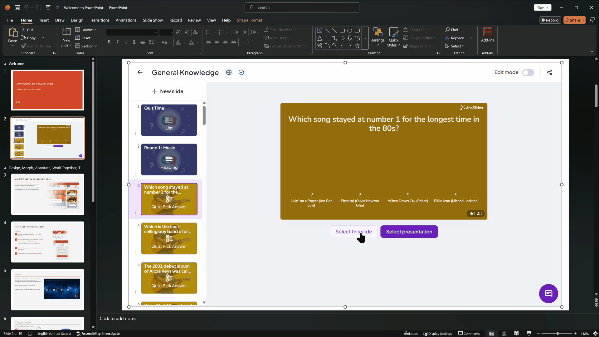 Once your presentation is ready, click 'Select Presentation'. Your AhaSlides presentation will now be added to the slide on PowerPoint. You can control the presentation like presenting on AhaSlides.