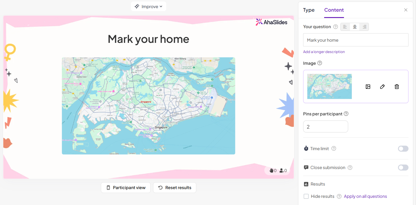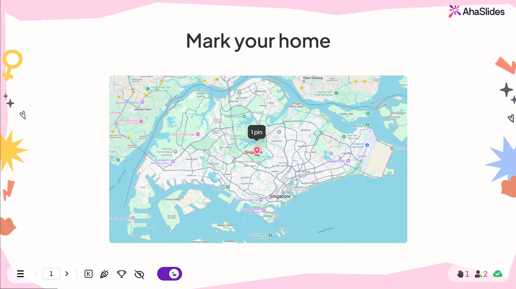 The Pin on Image slide lets participants interact with an image by placing pins on specific locations. This slide type is useful when you want your audience to identify or mark an area directly on an image, and is commonly used in interactive presentations to make visual questions more engaging and intuitive.