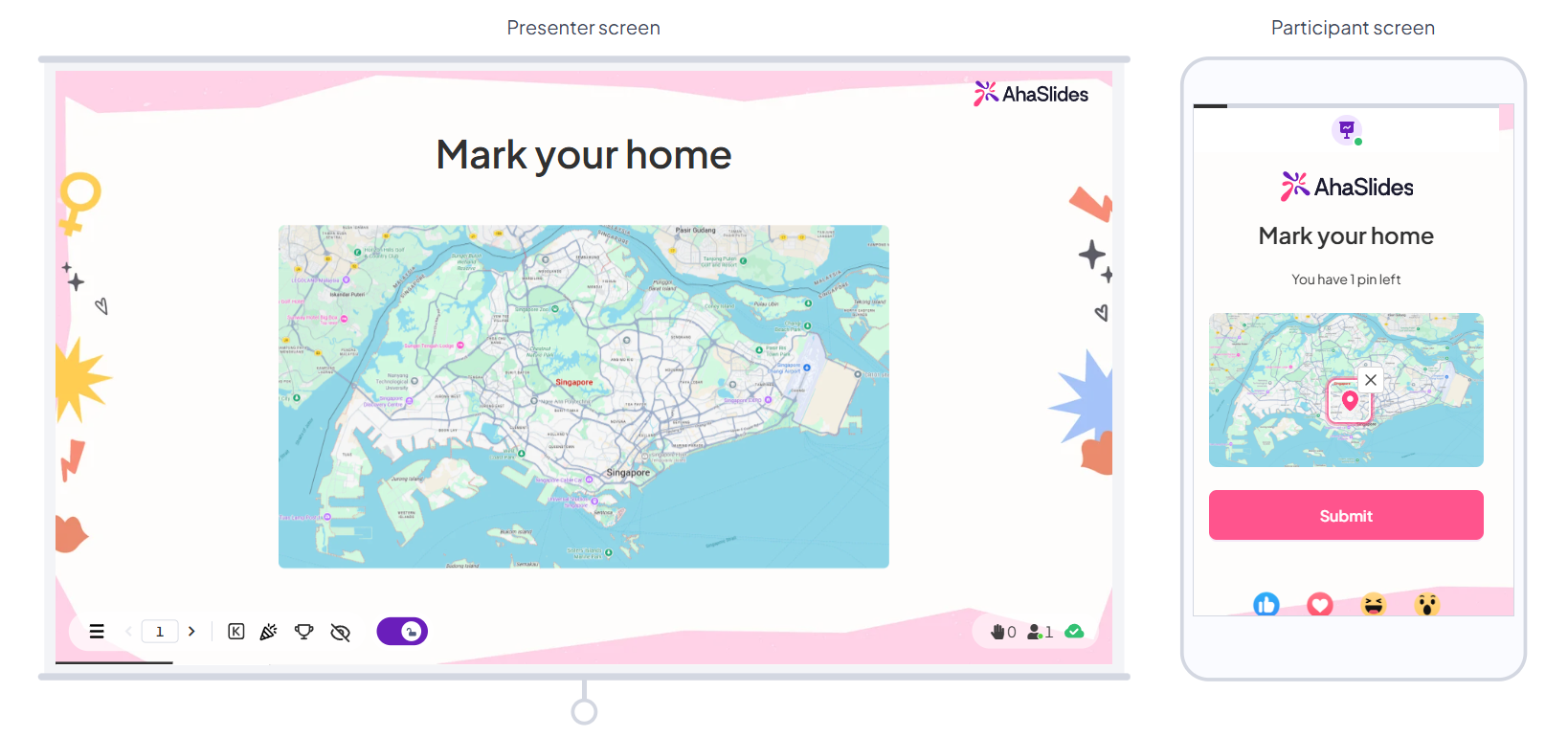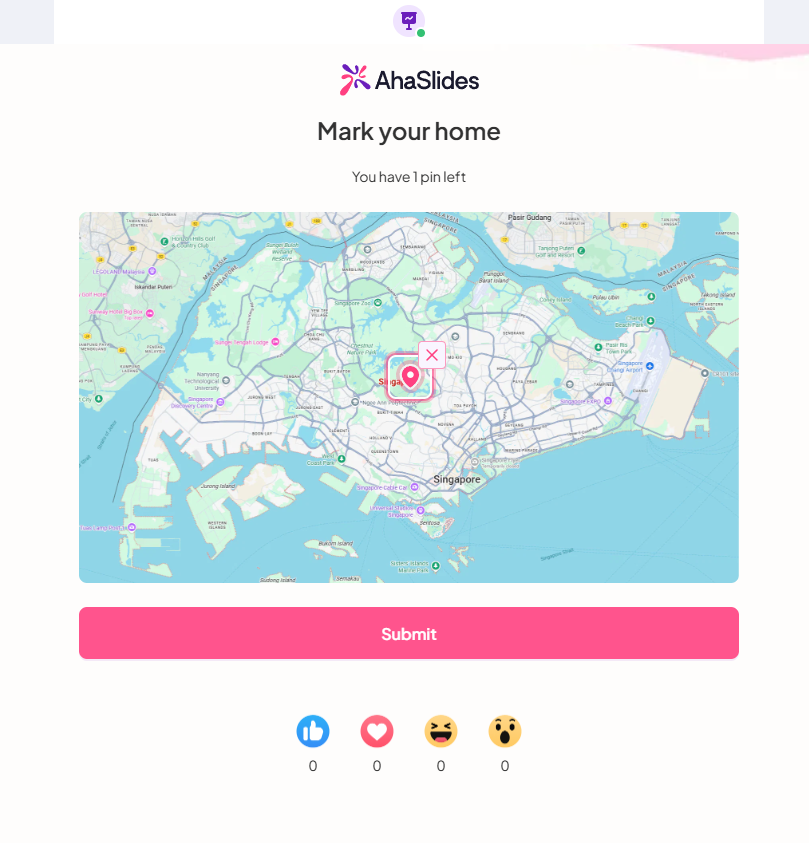 After placing the pins, they can press/click the Submit button to submit their pins. The pins will then appear on the presenter's screen for everyone to see