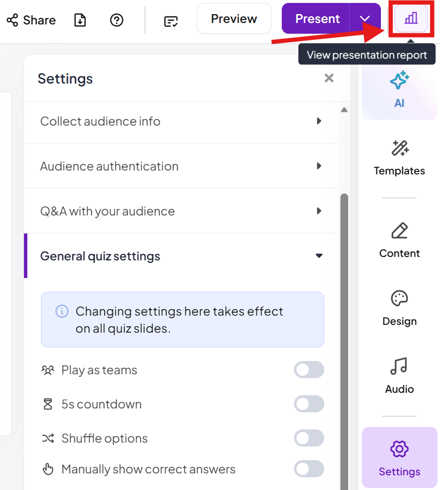 When at least one person has interacted with your presentation, you'll be able to see a report containing the following: