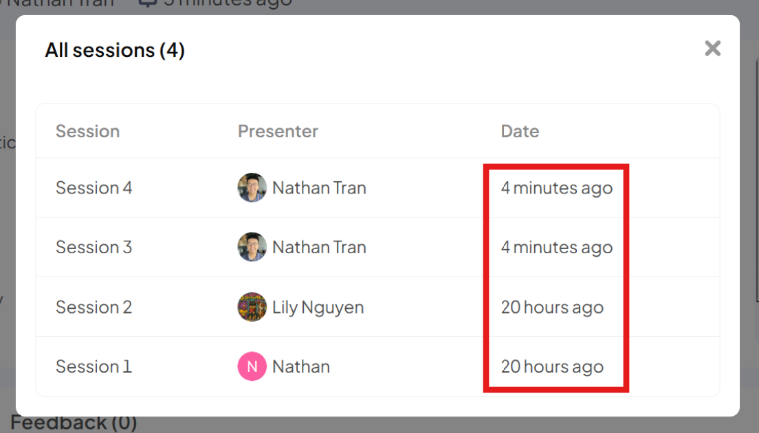 Feedback Column: This section shows all the feedback collected during the presentation, along with the overall rating score given by the audience.